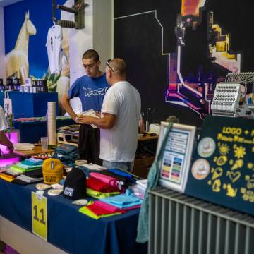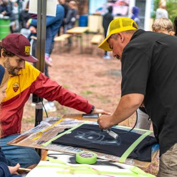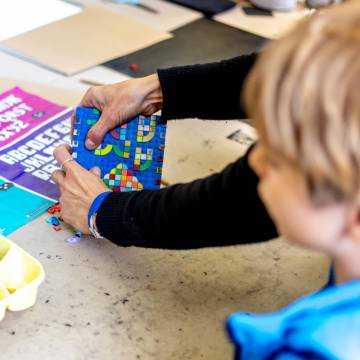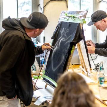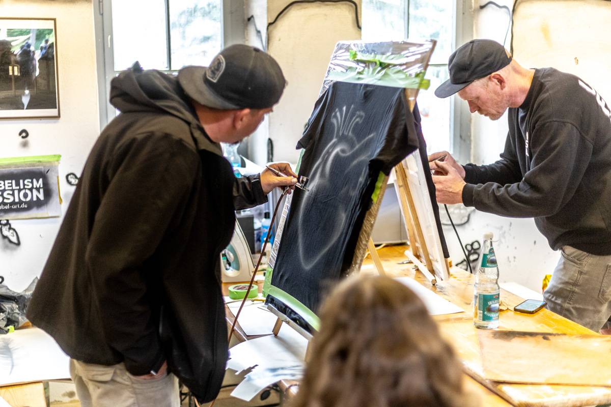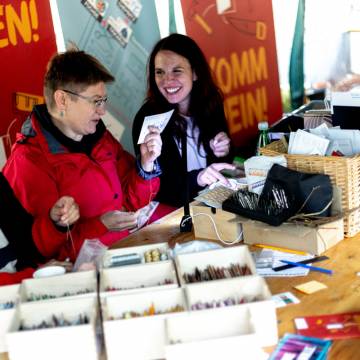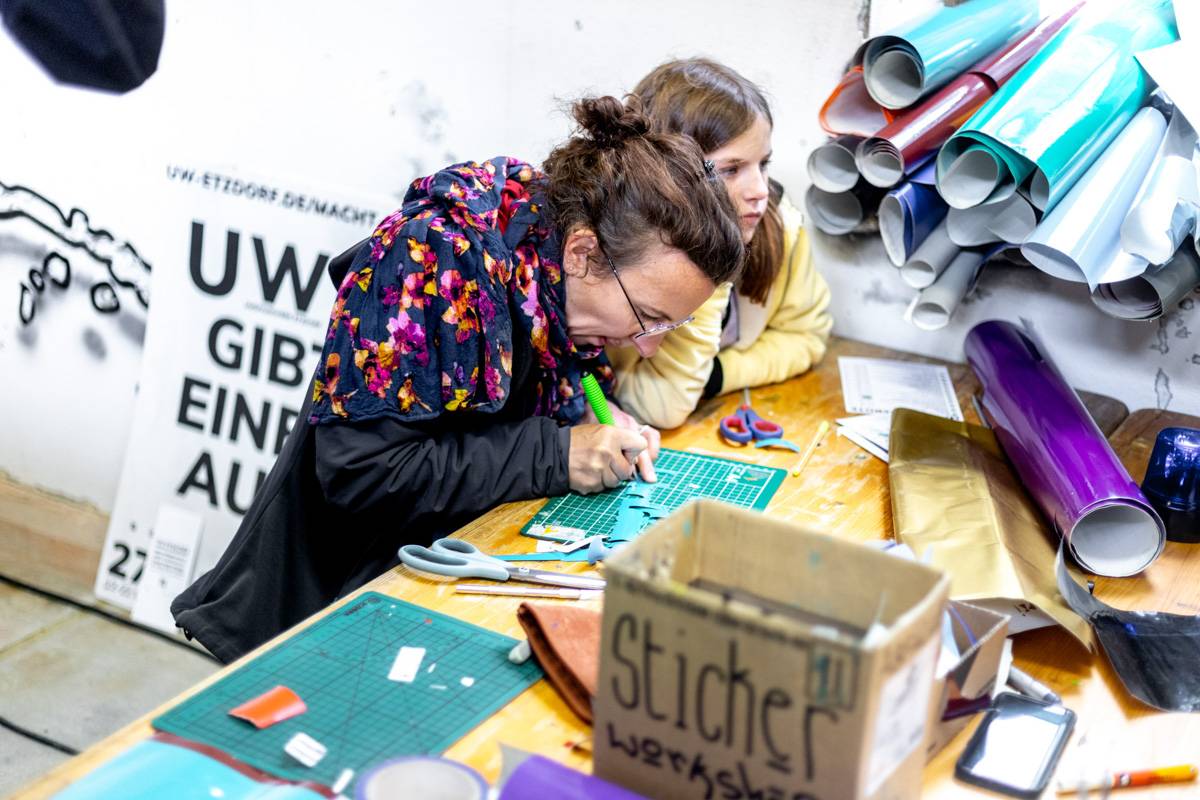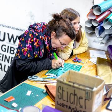 Visitors were not only able to observe the creative process and its results, but also get actively involved themselves: numerous hands-on workshops invited them to implement their own ideas and try out new things. The 2025 maker programme included: Etching | Screen printing | Lego meets printing | 3D graffiti – lettering in form | Felting | Jeans upcycling | Batik | Glass engraving with sandblasting | Bird Republic - Birdhouse building 2.0 | Embroidery | Tin jewellery – your unique piece in sepia | Tech art with electronic waste | Sticker cuts | Airbrushing | Pennant painting | Soft skills – your own cushion | Ma Skills DJ School | Site quiz | FabLab – building, embroidering, accelerating – analogue & digital.